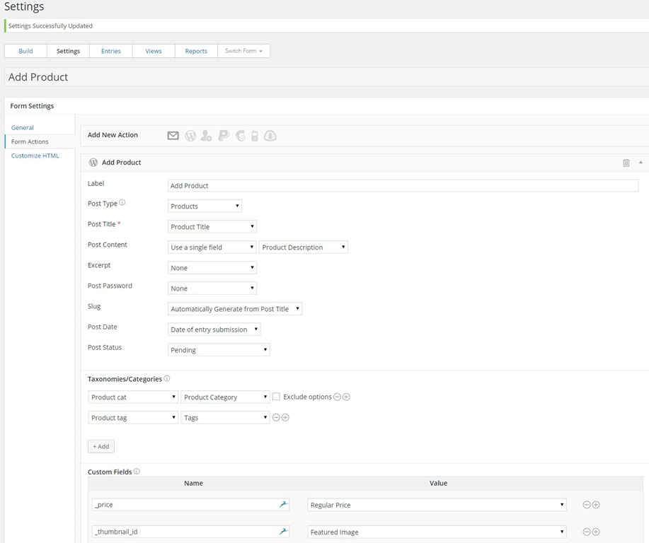 You can map many WooCommerce custom fields to the product form fields and this will gather the submitted data to the attached custom field such as price, featured image, regular price, sale price etc. You can also asign created post status to “draft”, “published” or even “pending review”.