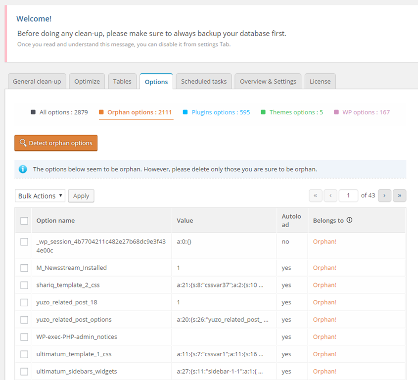 Options tab – This section displays all the options with their relationship with the particular themes/plugins or WordPress core. “detect orphan options” lets you discover orphan options and delete them in the blink of an eye.