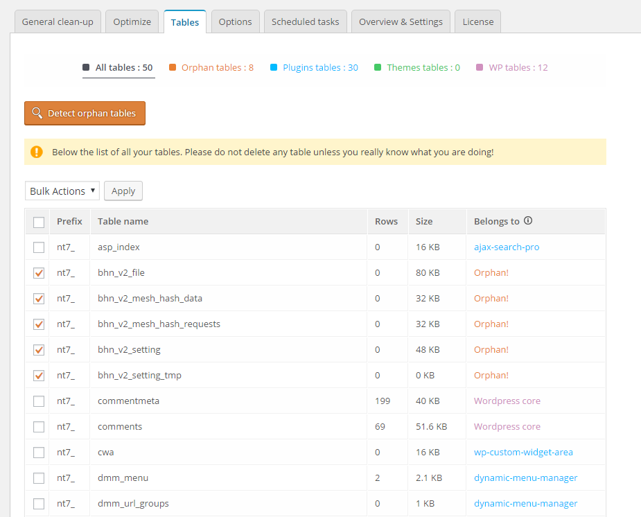 Tables tab – It is the most important section with the help of which we can delete unused database tables. ADC shows the tables relationship with related plugins or themes. This way you can easily identify which table is created by which plugin/theme. There is also a button “detect orphan table”. On clicking this button, plugin starts scanning the database for orphan tables and then all the orphan tables are displayed.